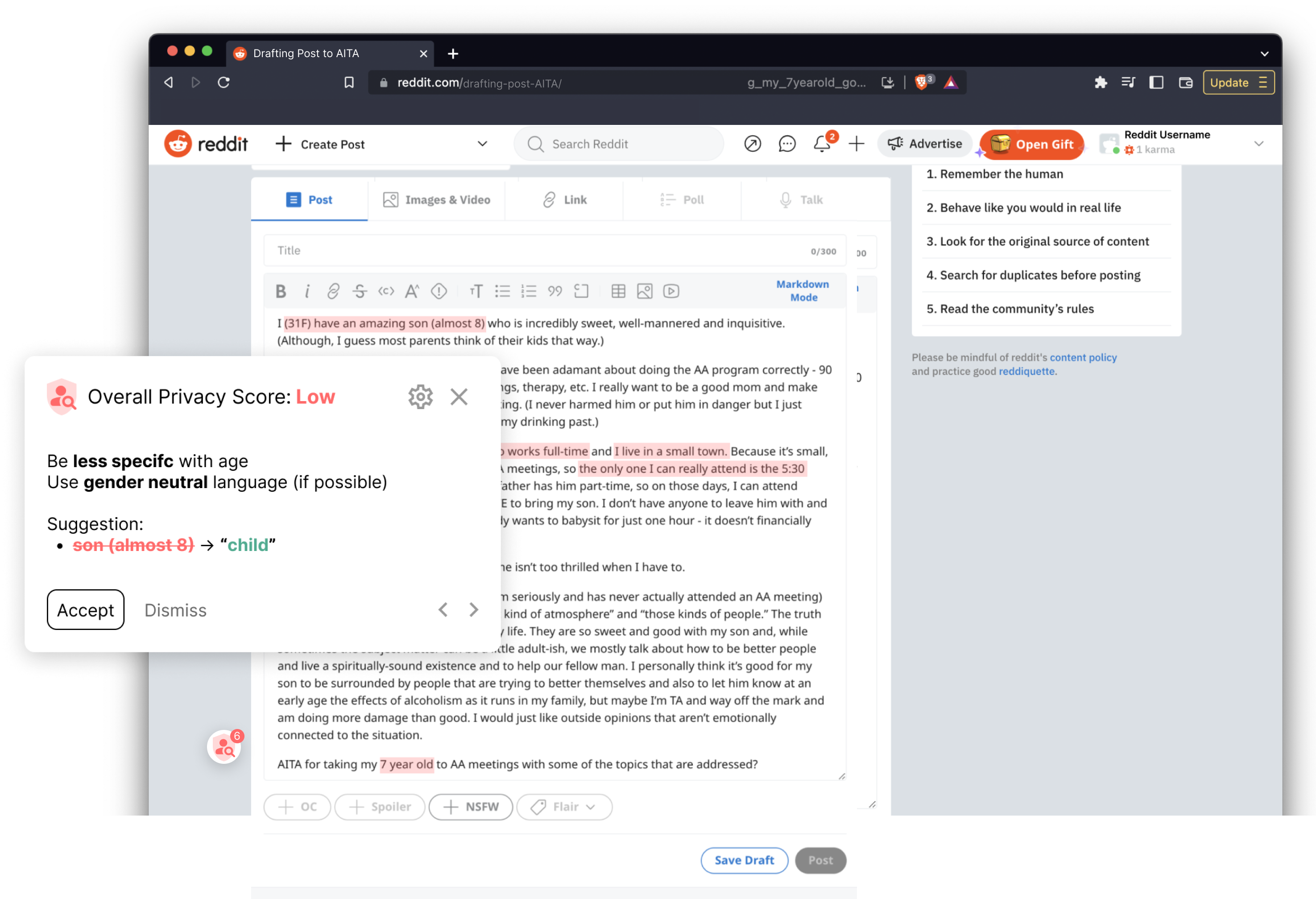 While the benefits to online self-disclosure are apparent, the privacy risks can be abstract and difficult for users to grasp or even identify...can we take technology that’s being used to re-identify users, and instead use it to help users reduce privacy risks in their posts?